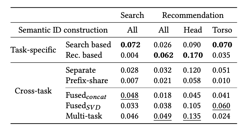 Joint Search&Recommendation 생성 모델에서 어떤 Semantic ID 구성 전략이 두 태스크를 동시에 잘 처리하는지 비교함