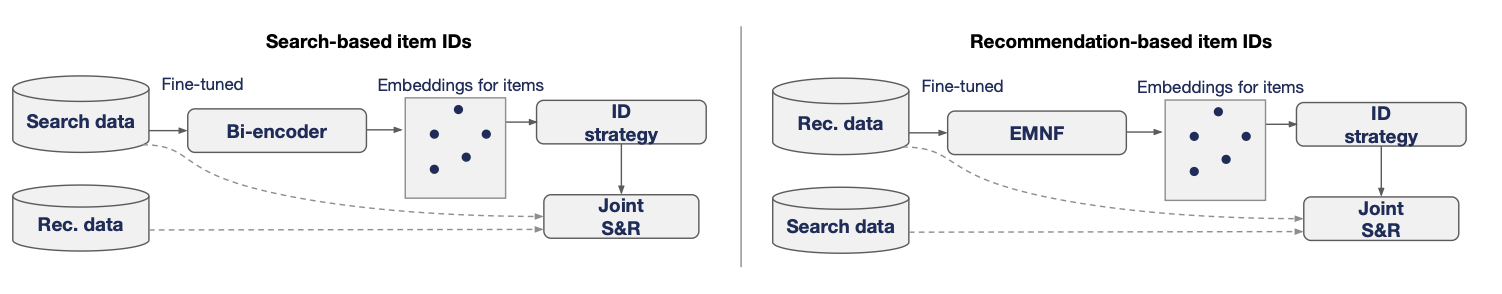 - 기존 한계: 선행 연구들은 태스크별 임베딩 (검색용 bi-encoder, 추천용 collaborative filtering) 으로 Semantic ID를 구성