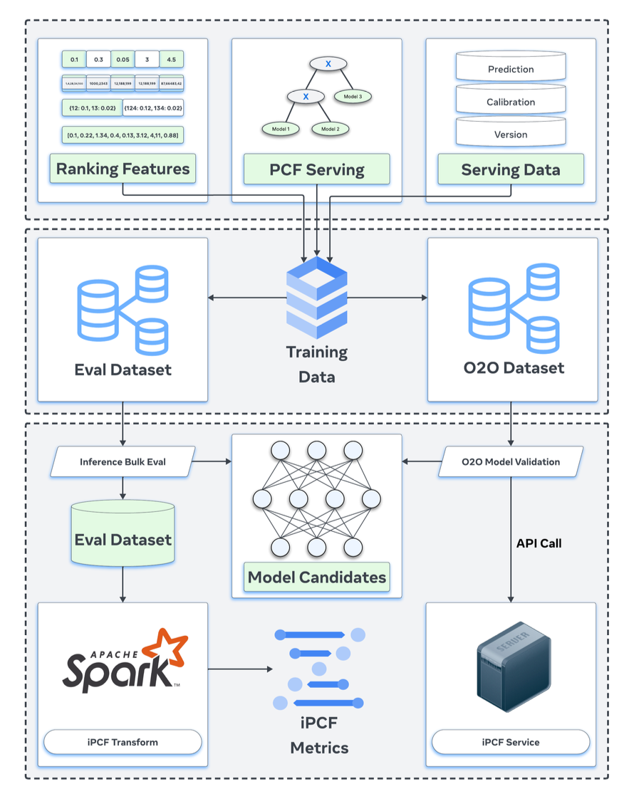 - 모델 학습 & 평가 데이터에 feature, label외에도 PCF version ID, serving시 raw model prediction, PCF tree하에서 각 모델 출력이 어떻게 꽂히는지 등을 포함함