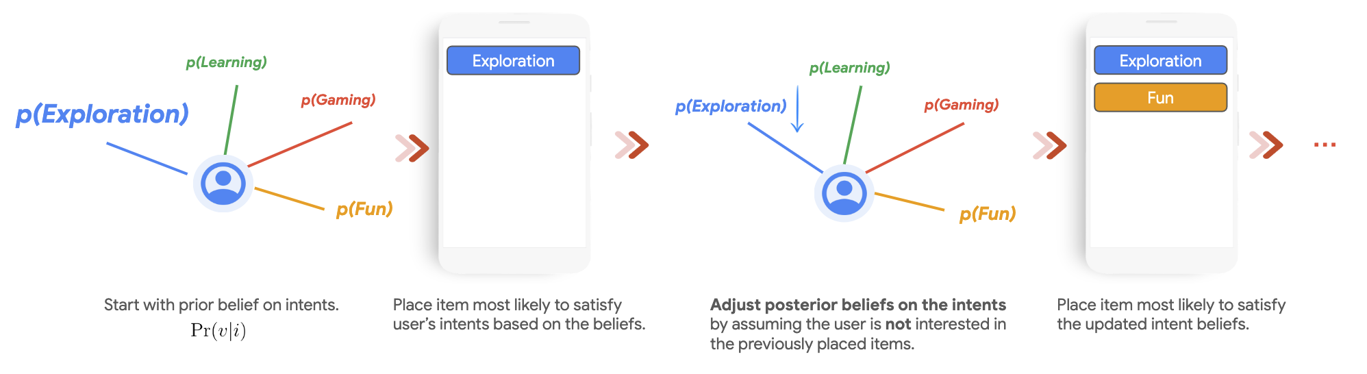 - (두번째부터는) 지금까지 선정된 아이템에 관심이 없다고 가정하고 의도에 대한 posterior를 업데이트한다. 업데이트된 확률에 따라 계속 사용자의 의도에 가장 부합하면서 좋아할 가능성이 높은 아이템을 선정하는 것을 반복한다.