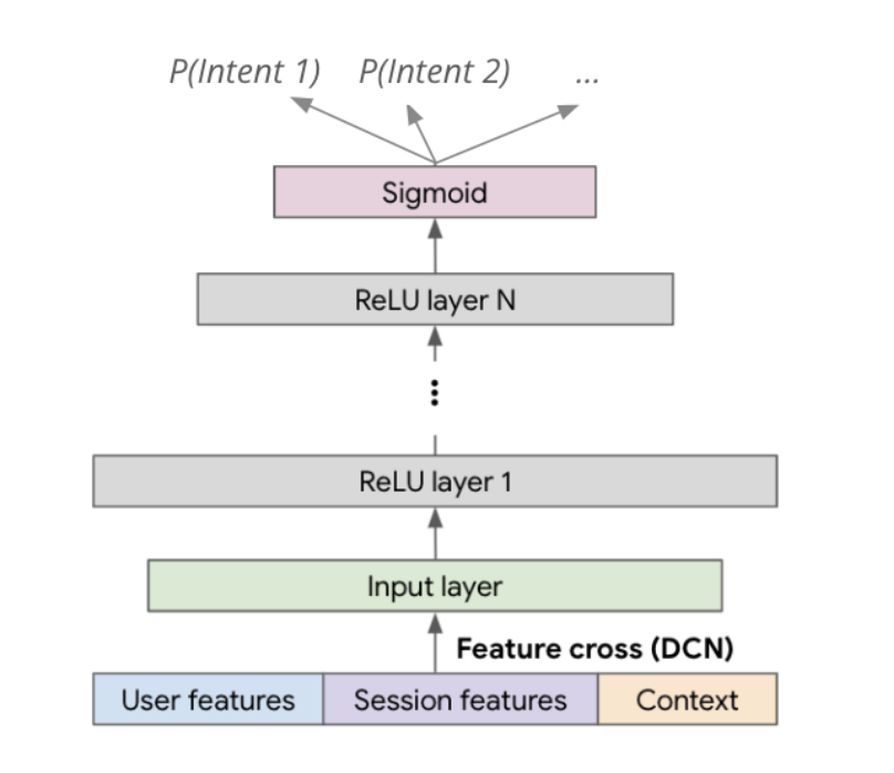 - 사용자의 의도 를 예측할 수 있도록 DCN(Deep & Cross Network) 컴포넌트를 포함한 모델 를 통해 학습