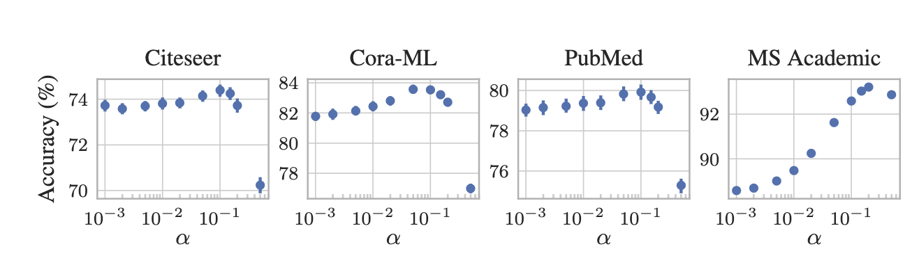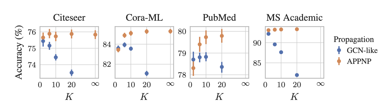 - 반면 APPNP는 가 증가할수록 정확도가 향상되다가 일정 이상 되면 안정화 (PPNP 해를 근사하는데 그렇게 엄청 큰 가 필요하진 않음)