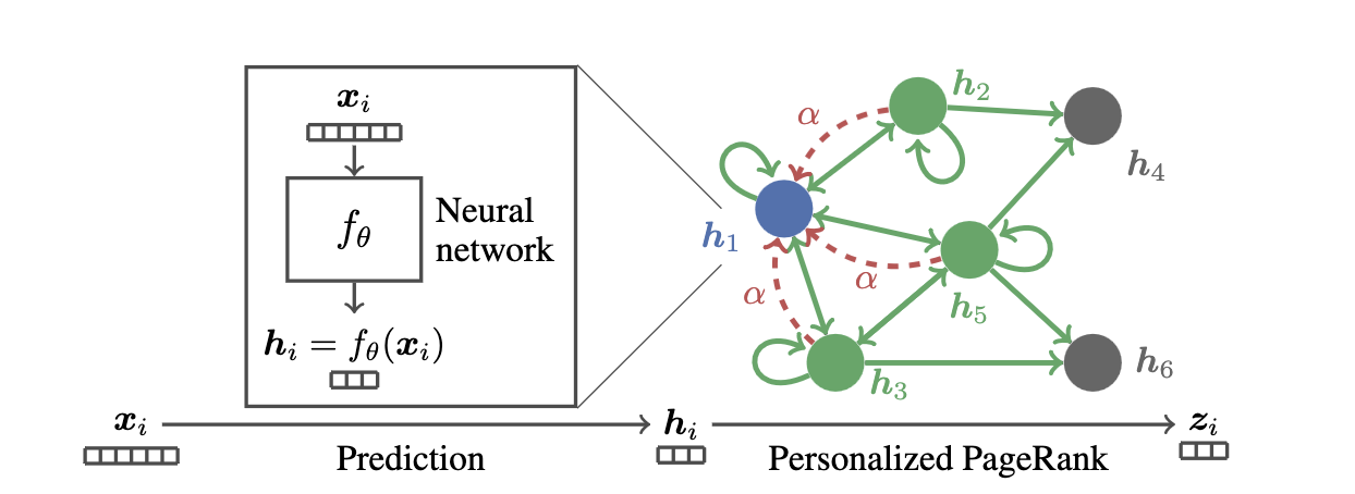 - 위에서 얻은 초기 예측 를 personalized pagerank를 사용해서 전파 (밑에 자세히 설명)