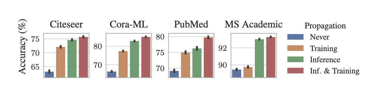 Never: 전파를 전혀 사용하지 않음 (표준 MLP처럼 노드 특징만으로 예측)Training: 학습 시에만 전파를 사용하고, 추론 시에는 전파 없이 신경망만 사용Inference: 학습 시에는 전파 없이 신경망만 사용하고, 추론 시에만 전파를 적용Inf. & Training: 둘다에서 전파를 사용 (표준 APPNP)- 결과: 표준적인 APPNP(