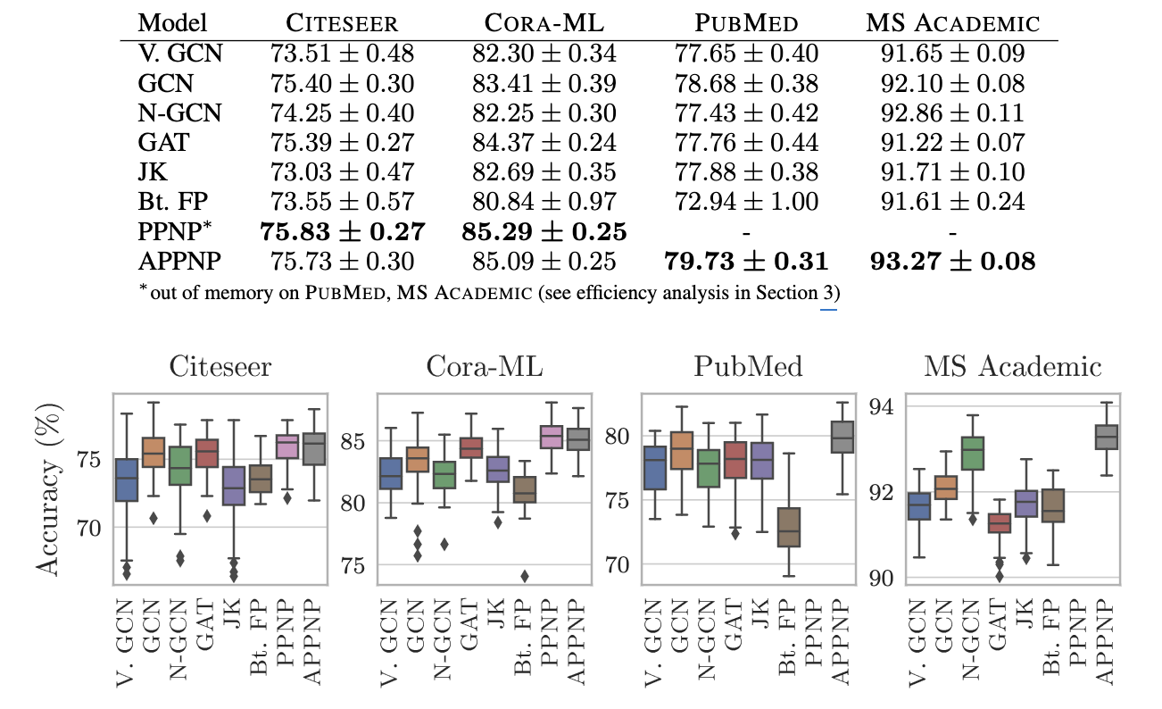 - PPNP는 PubMed와 MS Academic에서 메모리 부족(out of memory)으로 실행할 수 없었음 = 대규모 그래프에서는 부적합