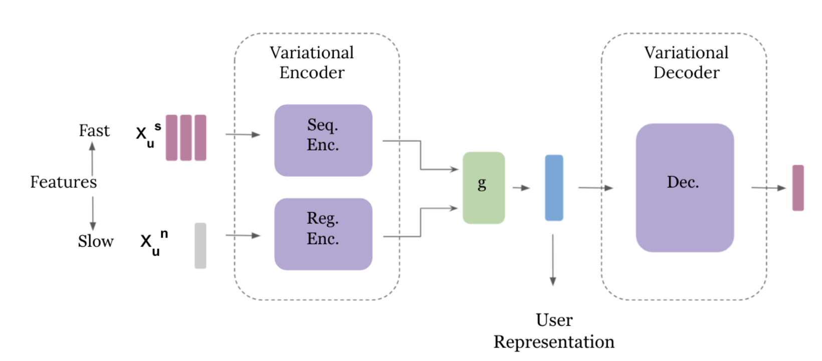 - Slow Features와 Fast Features를 각각 두 개의 다른 인코더로 나눠서 처리하고 그 두 개의 인코더에서 얻은 latent vector를 결합(concat)해서 최종적인 유저 representation을 얻음