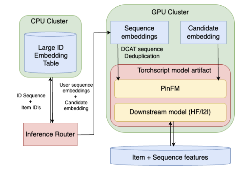 - Inference router는 사용자 시퀀스 및 candidate item에 대한 관련 ID embedding을 CPU 클러스터에서 가져와 GPU 클러스터로 전달