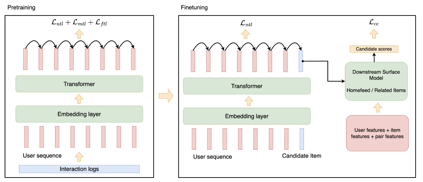 - 200억 개 이상의 파라미터를 가진 Transformer 모델을 방대한 사용자 활동 데이터로 pretrain한 후 특정 애플리케이션에 맞게 fine-tuning