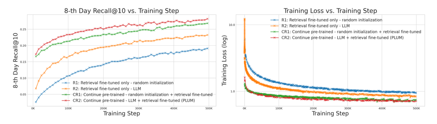 - 8th-day Recall@10 및 training loss vs training step. CPT 적용 모델이 훨씬 빠른 수렴