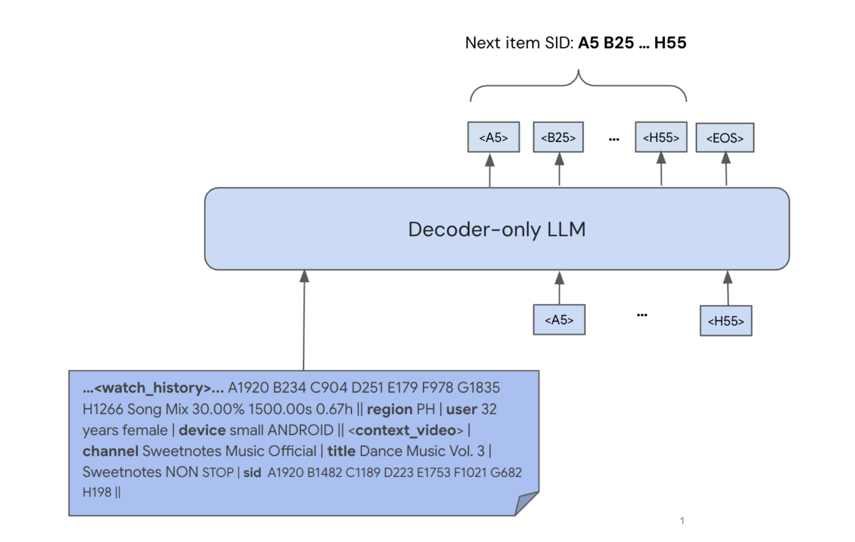 - Generative Retrieval 전체 흐름: SID 토큰, 텍스트, numerical feature 토큰이 혼합된 입력 프롬프트 → 다음 영상의 SID를 decoder-only LLM이 autoregressive 생성
