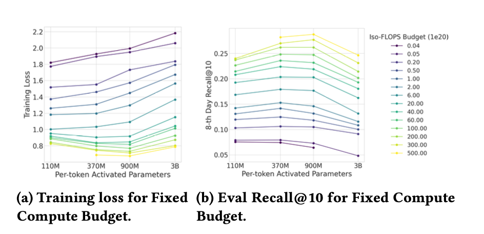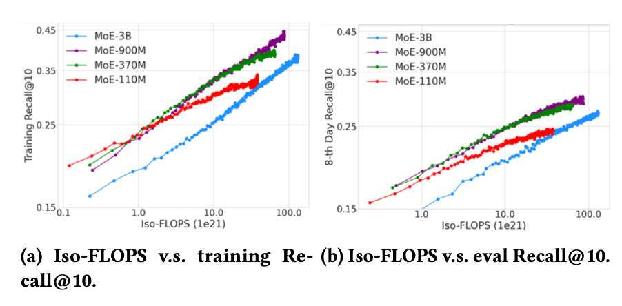 - Iso-FLOPS vs Recall@10: 포화 징후 없이 계속 향상. MoE-110M도 4.24 epoch 학습해도 overfitting 없음