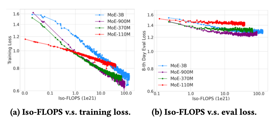 - Iso-FLOPS vs training/eval loss: power-law 상관관계. eval loss frontier가 training loss보다 훨씬 빠르게 대형 모델로 이동 → 대형 모델이 미래 데이터 일반화에 유리