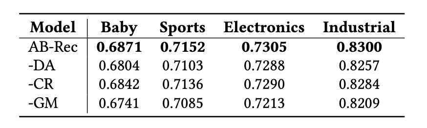 - Industrial AUC: AlignRec 0.8253 → AB-Rec 0.8300 (+0.0047)