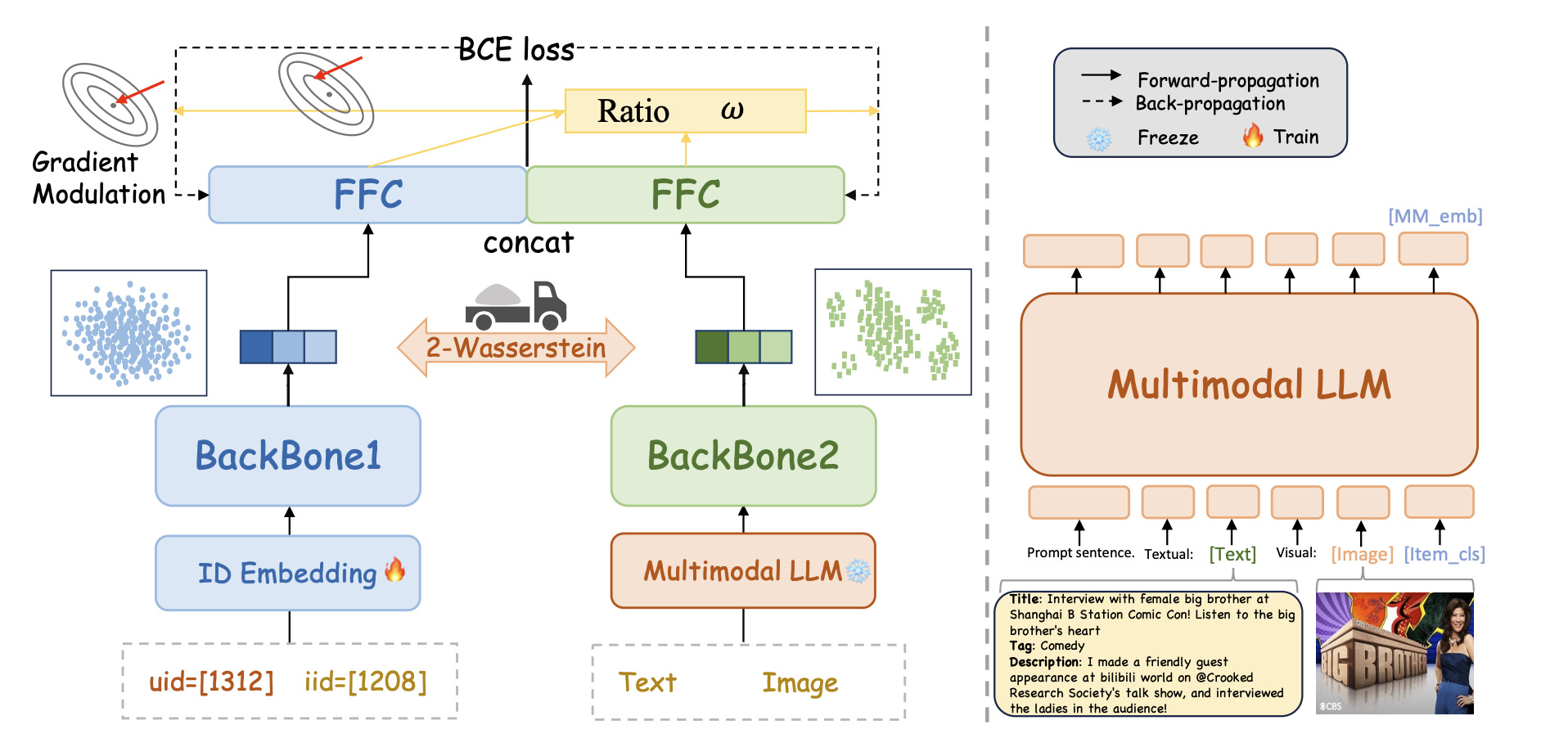 - MLLM(freeze)로 MM 임베딩 생성 → BackBone1(ID)과 BackBone2(MM)를 각각 학습 → 2-Wasserstein alignment + Gradient Modulation 적용 → BCE loss