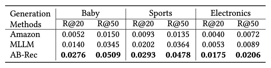 - AB-Rec이 R@20, R@50 모두에서 압도적으로 우위 (예: Baby R@20: 0.0052 → 0.0140 → 0.0276)