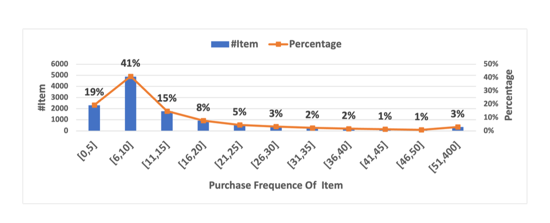 • ARD Toys and Games 데이터셋의 long-tail 분포: 약 20% 아이템이 5회 이하 구매 → 심각한 희소성