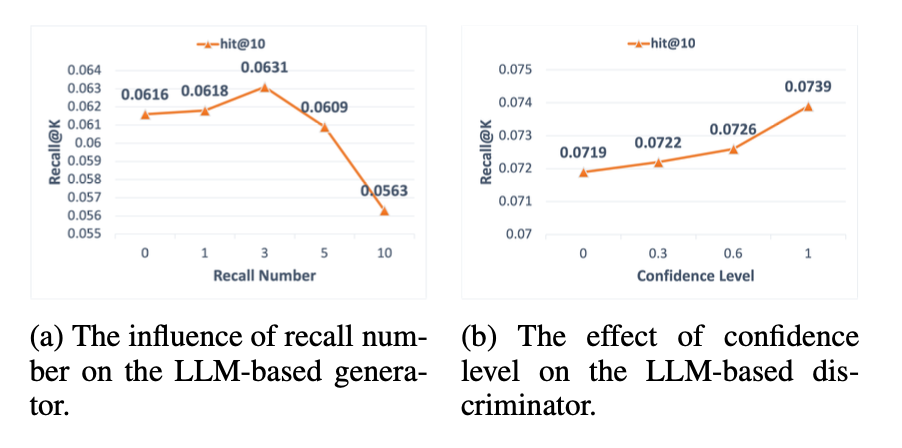 • (b) Discriminator의 confidence level이 높을수록 Recall@10 성능 향상 → 고신뢰 데이터 선별이 핵심