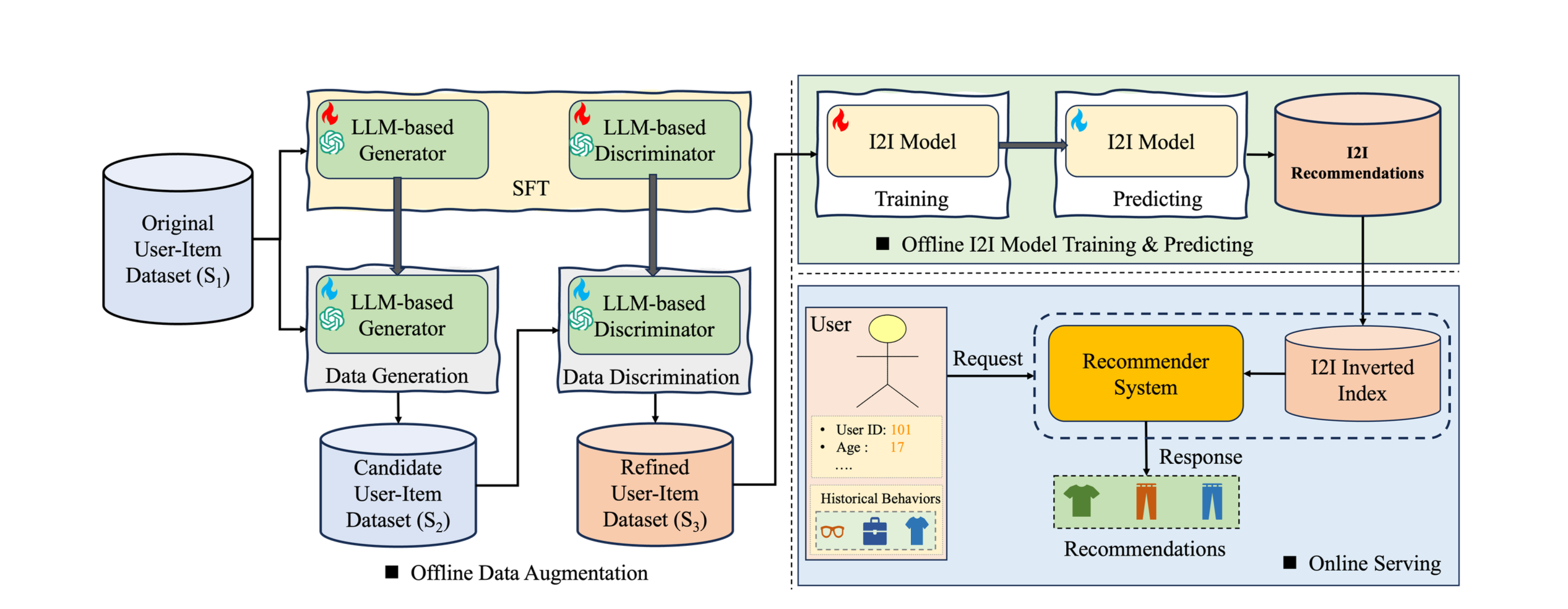 • 전체 파이프라인: LLM-based Generator → 합성 데이터 생성 → LLM-based Discriminator → 품질 필터링 → 원본 데이터와 융합 → I2I 모델 학습