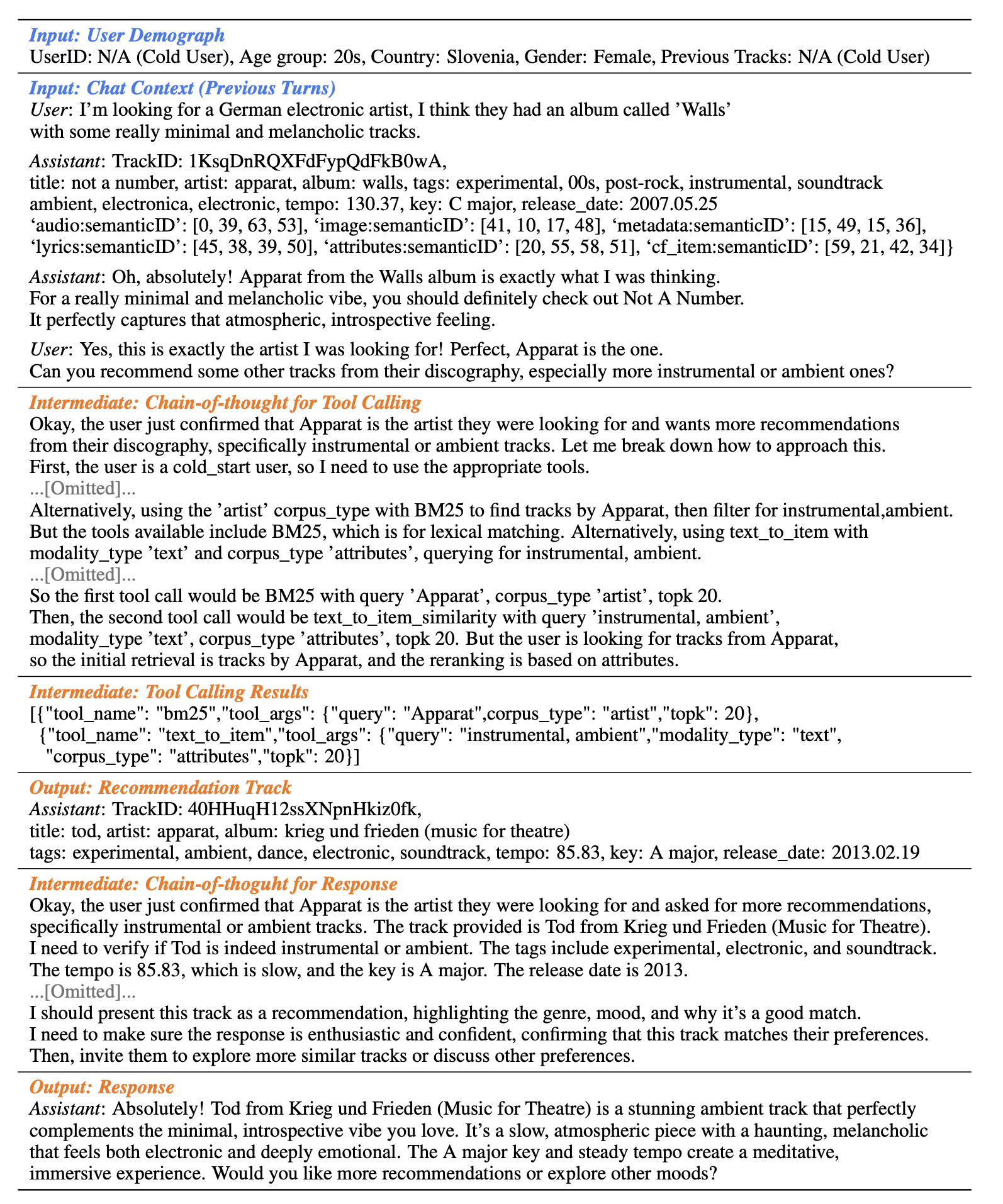 - Previous Conversation History: 이전 쿼리 + 추천 음악(메타데이터+Semantic IDs 포함) + LLM 응답