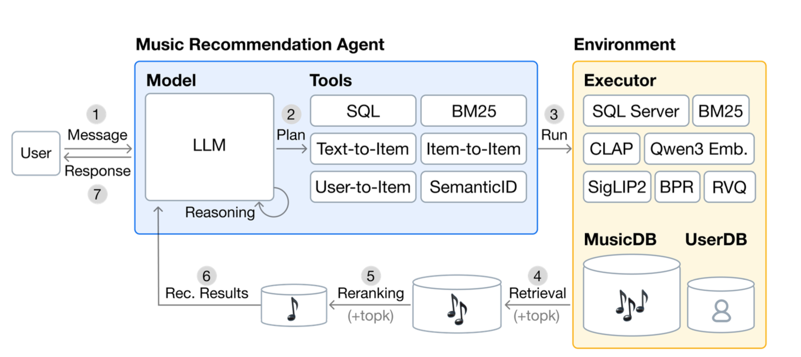 - External Environment: 실제 tool을 실행하는 executor + DB (MusicDB, UserDB)