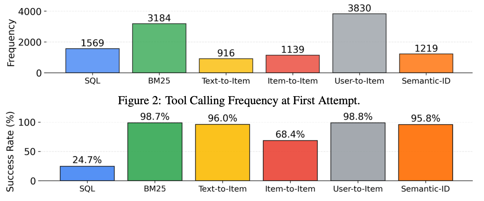 사용 빈도: BM25(3184) > User-to-Item(3830) > Semantic ID(1219) > Text-to-Item(916) > Item-to-Item(1139) > SQL(1569)