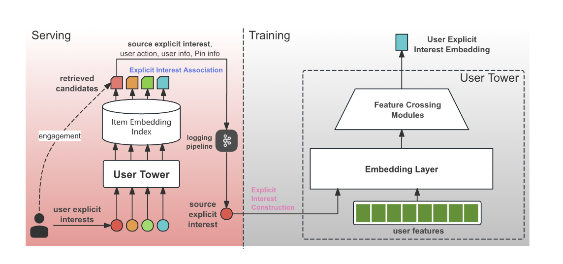 - 일반적인 two-tower model에서는 유저를 하나의 유저 임베딩으로 인코딩하는데 이 유저 임베딩에는 사용자의 모든 관심사를 “평균적으로” 또는 “가장 지배적인” 형태로 하나의 벡터에 담게 됨
