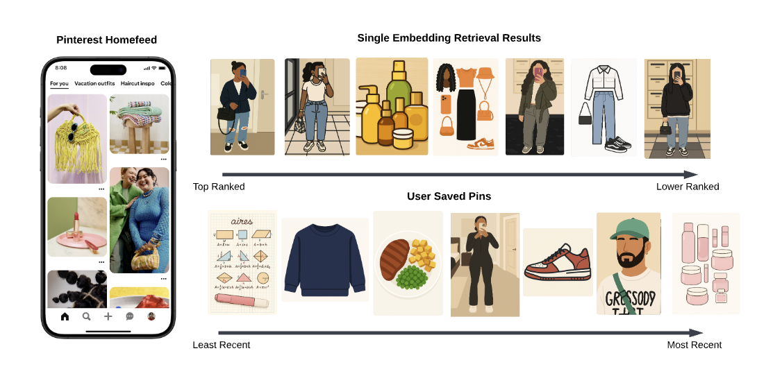 - user의 saved pins(explicit feedback)을 보면 음식, 교육, 뷰티 등 다양한 관심사가 있지만 vanilla two-tower model 하나의 retrieval 결과만으로는 이를 커버하지 못함