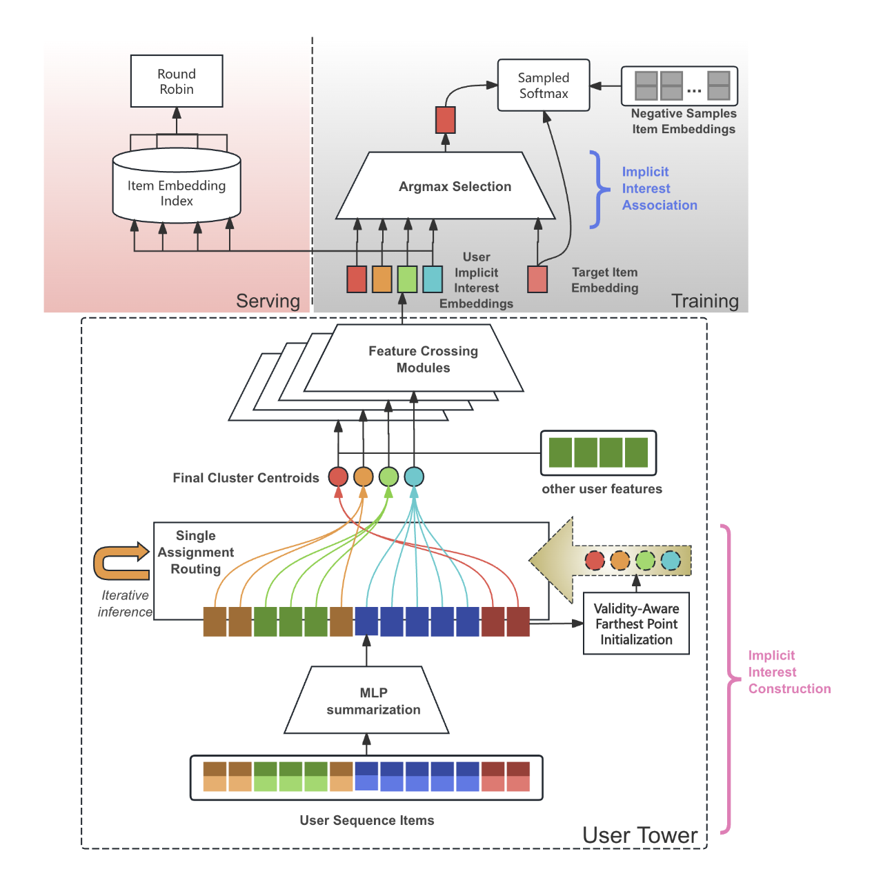- 각 아이템이 여러 클러스터에 기여할 수 있는 기존 방식과 달리, 가장 유사한 하나의 클러스터 중심에만 할당되도록 함 (클러스터 중심들이 서로 수렴하여 붕괴하는 것을 방지하고, 각 클러스터가 고유한 관심사를 나타내도록)