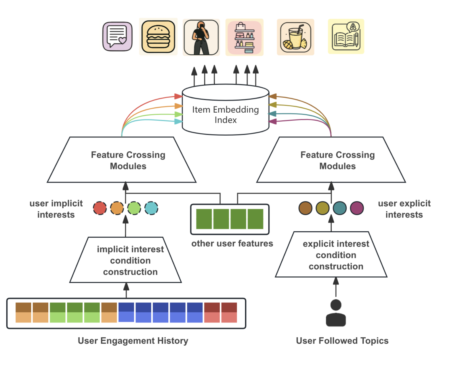 - 이 조건 임베딩은 사용자 타워(user tower) 내의 피처 교차(feature crossing) 레이어를 거쳐, 사용자와 조건 간의 고차원 상호작용을 학습 → 조건부 사용자 임베딩