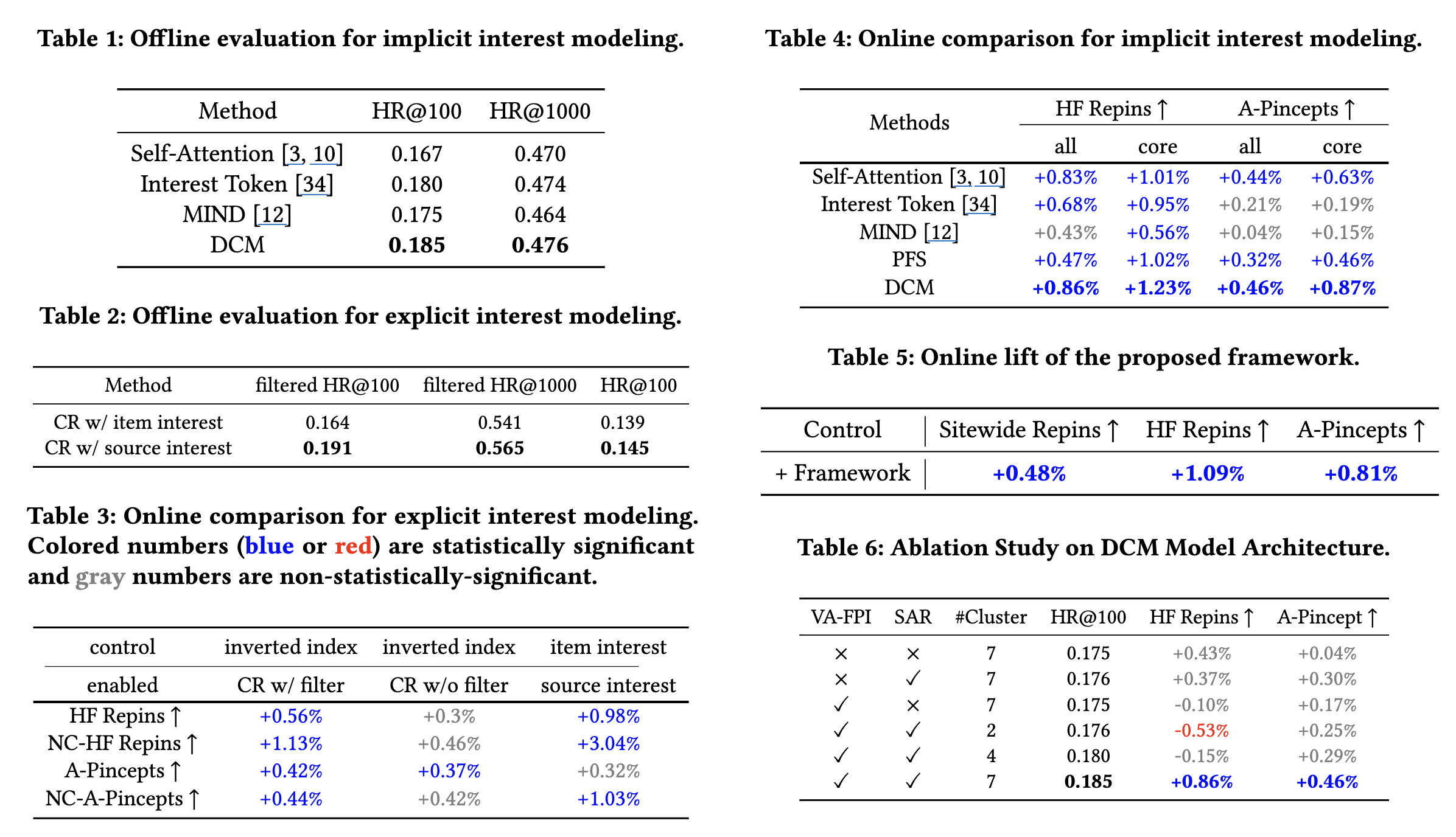 - DCM은 HR@100과 HR@1000에서 Self-Attention, Interest Token, MIND, PinnerFormer Subsequence (PFS) 기반 모델을 포함한 다른 암시적 관심사 모델들을 능가
