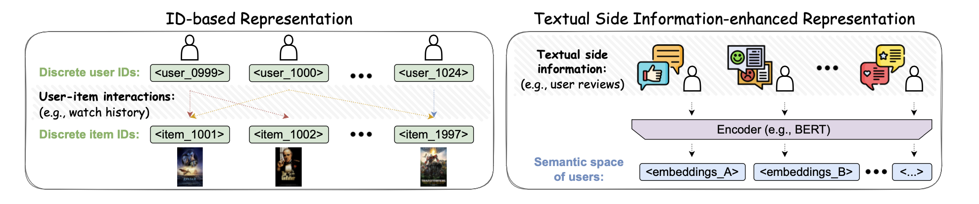 - ID가 아닌 사용자와 아이템의 텍스트 정보(프로필, 설명, 리뷰)를 LLM으로 인코딩