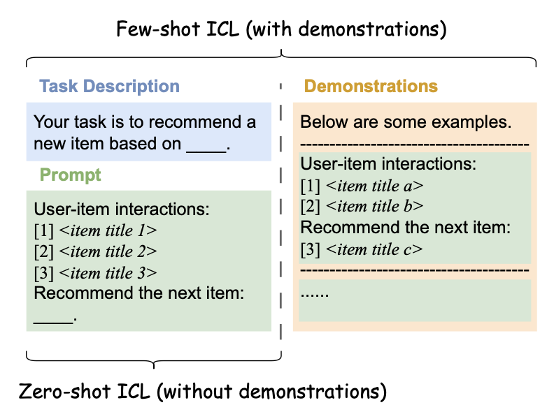 - Zeo-shot ICL은 태스크별 추천 데이터셋을 별도로 준비할 필요가 없다는 장점이 있고, 대화형 추천처럼 사용자가 LLM에 명시적인 예제를 제공하지 않는 상황에 적절
