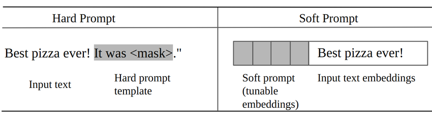 - 직접 텍스트 형태의 프롬프트를 설계해서 고정된 템플릿 형태를 취하는 하드 프롬프트(Hard Prompting) 방식과 학습 가능한 벡터를 추가하여 최적의 프롬프트를 자동으로 찾는 방식의 소프트 프롬프트(Soft Prompting) 방식으로 나누어 볼 수 있음