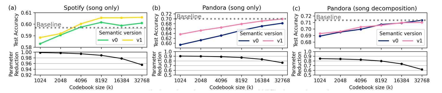Pandora song-only: v1 k=32768에서 baseline 일치 (~75% 파라미터 절감)