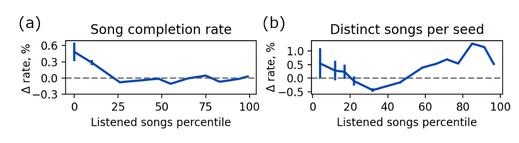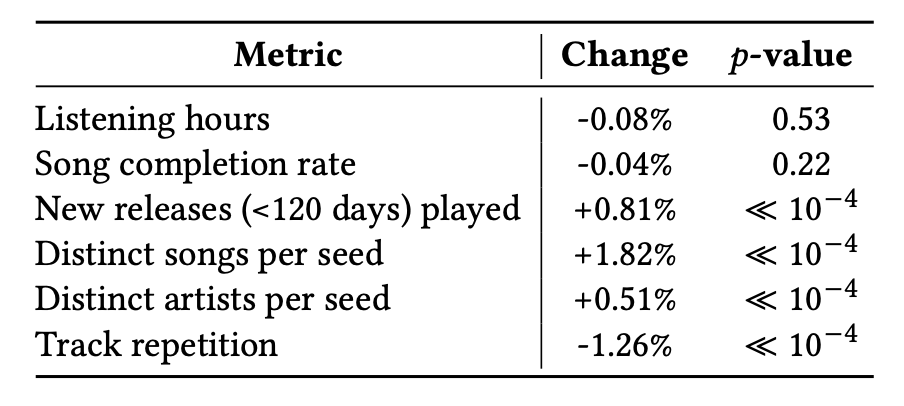 - Distinct songs per seed +1.82%, Track repetition -1.26%, New releases +0.81% 등 다양성 지표는 통계적으로 유의미한 개선 (p≪10⁻⁴)