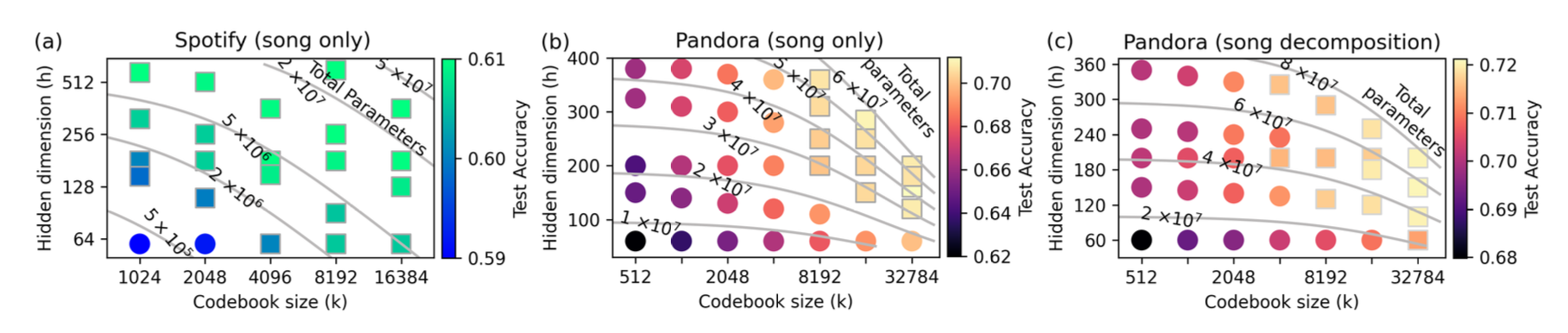 - 파라미터 수 ~75%(Pandora), ~99%(Spotify) 절감하면서 baseline 성능 유지 또는 초과