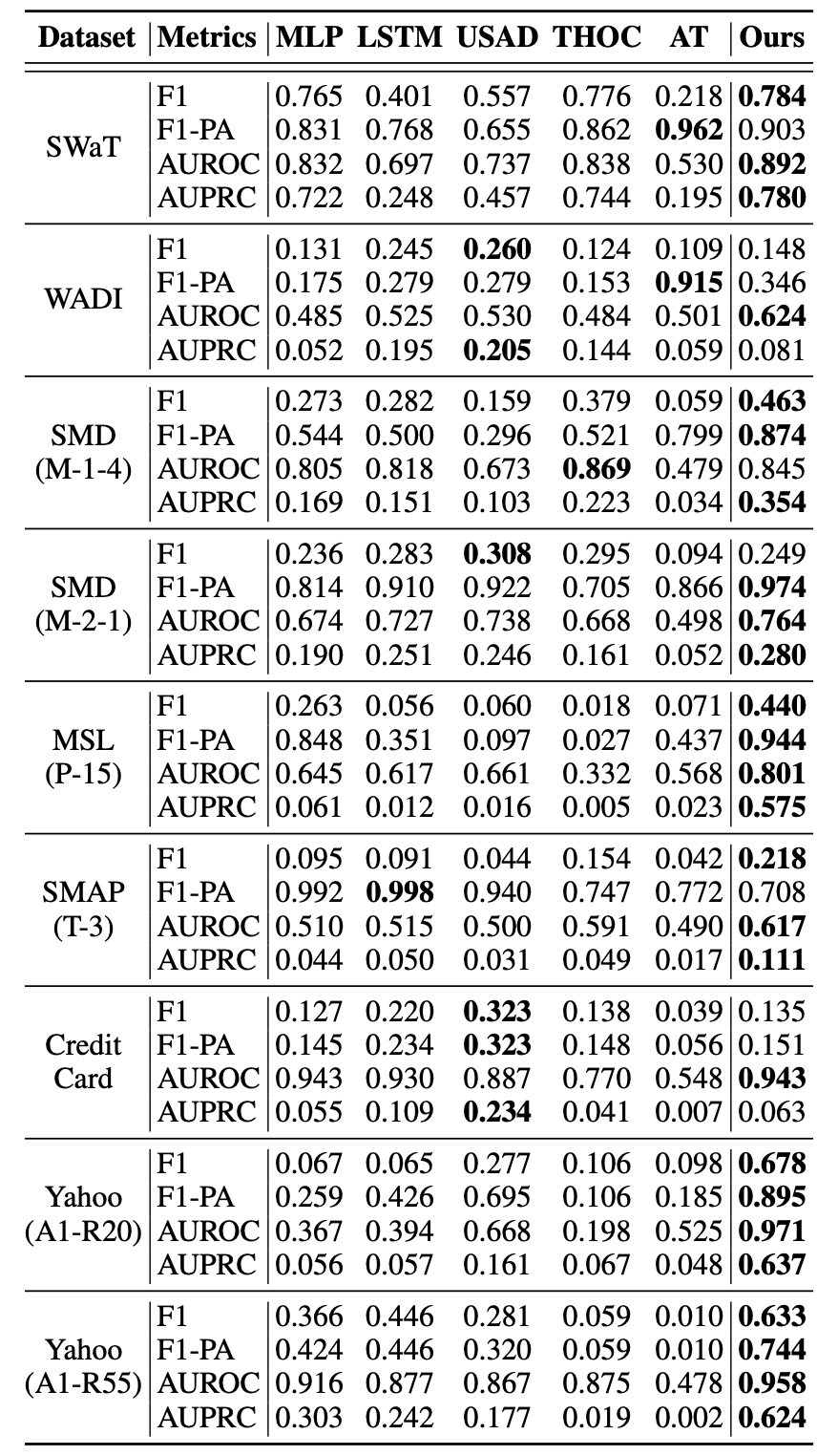 - 재미있는 점은 SOTA 모델 중 하나인 Anomaly Transformer가 일부 데이터에서 본 논문의 모델보다 F1-PA만 잘 나온다는 것인데 (나머지 F1, AUROC, AUPRC는 처참하게 낮음) AT는 문제가 있는 특정 구간을 잡아내지만 pointwise로 정확한 판단은 못하고 있다는 걸 알 수 있음
