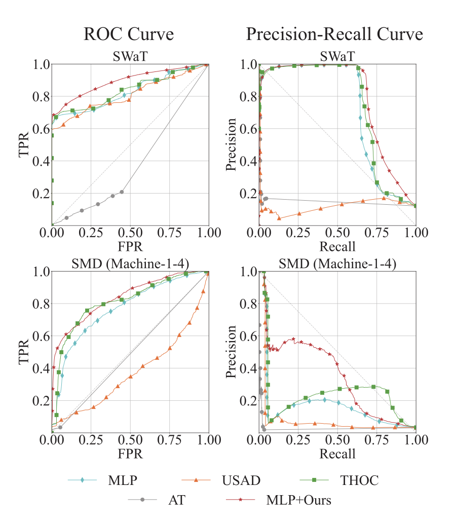 - (b) 간단한 MLP 기반 오토인코더를 사용했을 때도 이 논문이 제시하는 모듈을 붙인다면 F1 기준으로 기존 SOTA를 능가하더라 라는 그림.