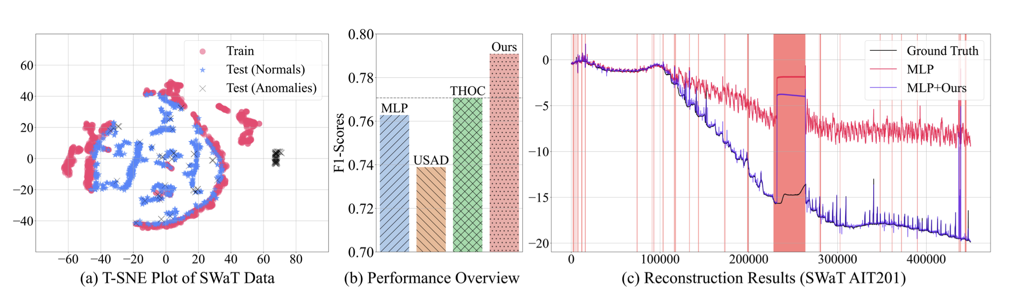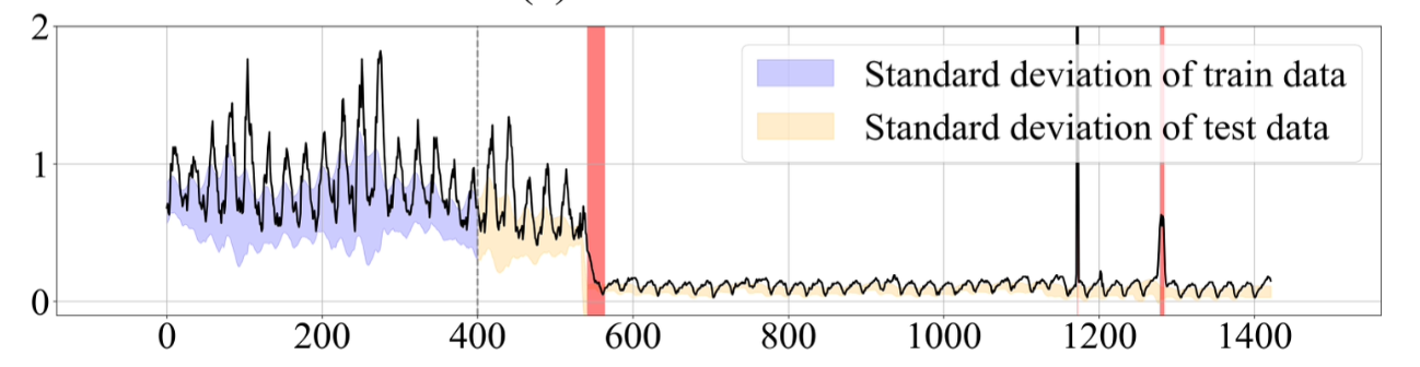 - (a) SWaT라는 시계열 이상탐지 분야의 벤치마크 데이터셋에 대해 T-SNE 시각화. 학습 데이터와 테스트 데이터 간의 shift가 상당히 발생하는 데이터셋임을 알 수 있음.