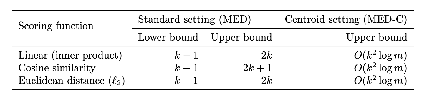 - 이 논문은 그 결론을 이론적으로 반박 - MED는 m과 무관하게 2k차원이면 충분하고, 실제 병목은 learnability 문제임을 주장함 (기하 공간은 충분히 넓은데 그냥 딱 맞는 벡터를 뽑아내는 모델을 학습하는 게 어려운 거임)